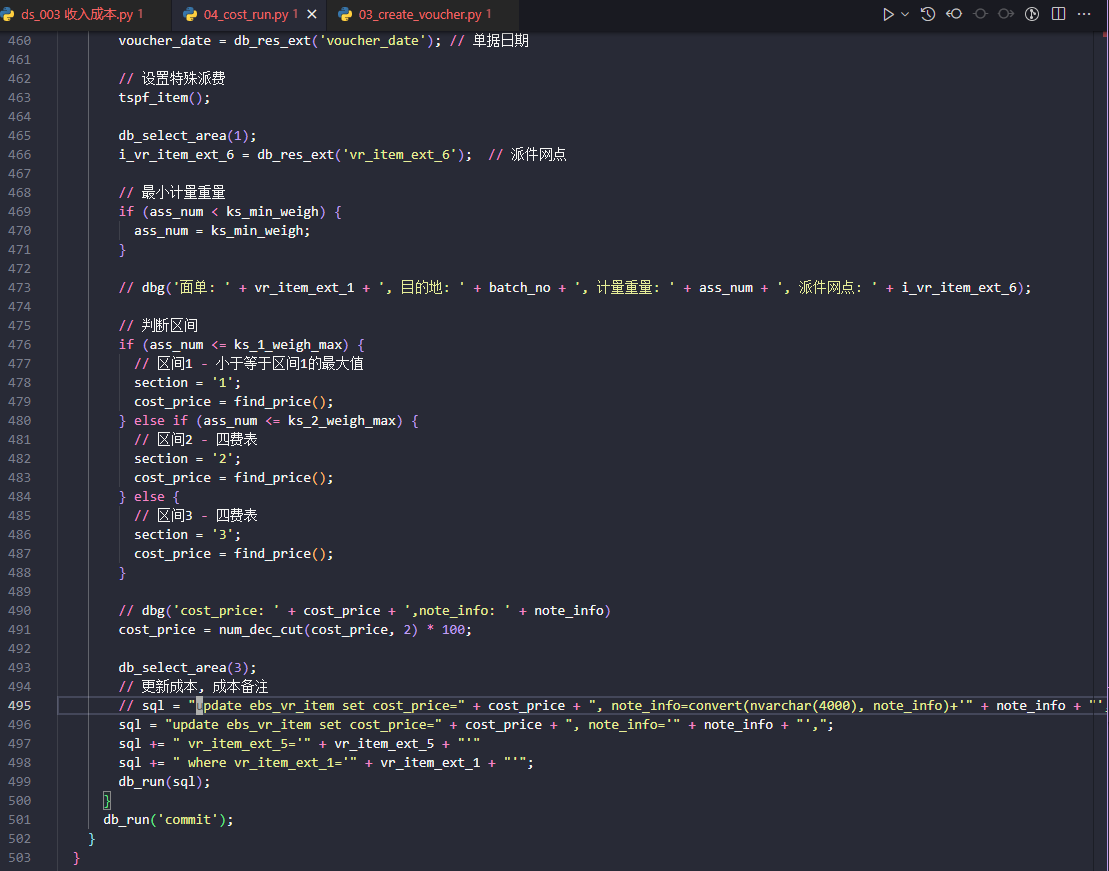 补充说明: 客户是快递行业,每天有十几W条面单数据, 需要生成单据,并且计算成本(有一定的成本计算规则,不同于系统内部的成本计算规则)。 所以在服务器中写了脚本程序,生成单据和计算更新成本。 现在已经稳定了,oit系统能很好的执行,虽然中间技术尝试的过程是比较繁琐辛苦的。 不喜欢用存储过程,是因为存储过程代码没有oit脚本直观, 修改起来不方便, 至于效率上,在服务器上执行也还可以的,能接受。 服务器本地也不会受网络原因, 掉线或者出现问题的机率小。 |