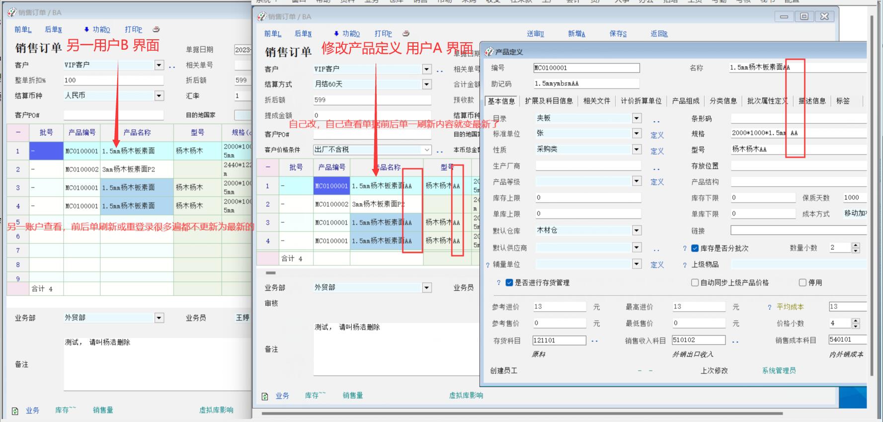讨论_修改产品资料,不同用户看到已做单据内容不一致,刷新不及时_产供销