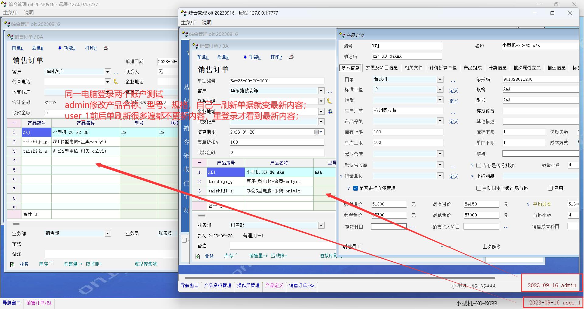 同一电脑登录两个账户测试,环境:网络版/access数据库/版本 20230916 (mssql数据库测试也不同步更新)