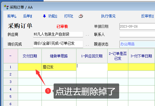操作顺序: 1 功能菜单下 对审核后单据进行调整 2 删除日期 3 更新 |