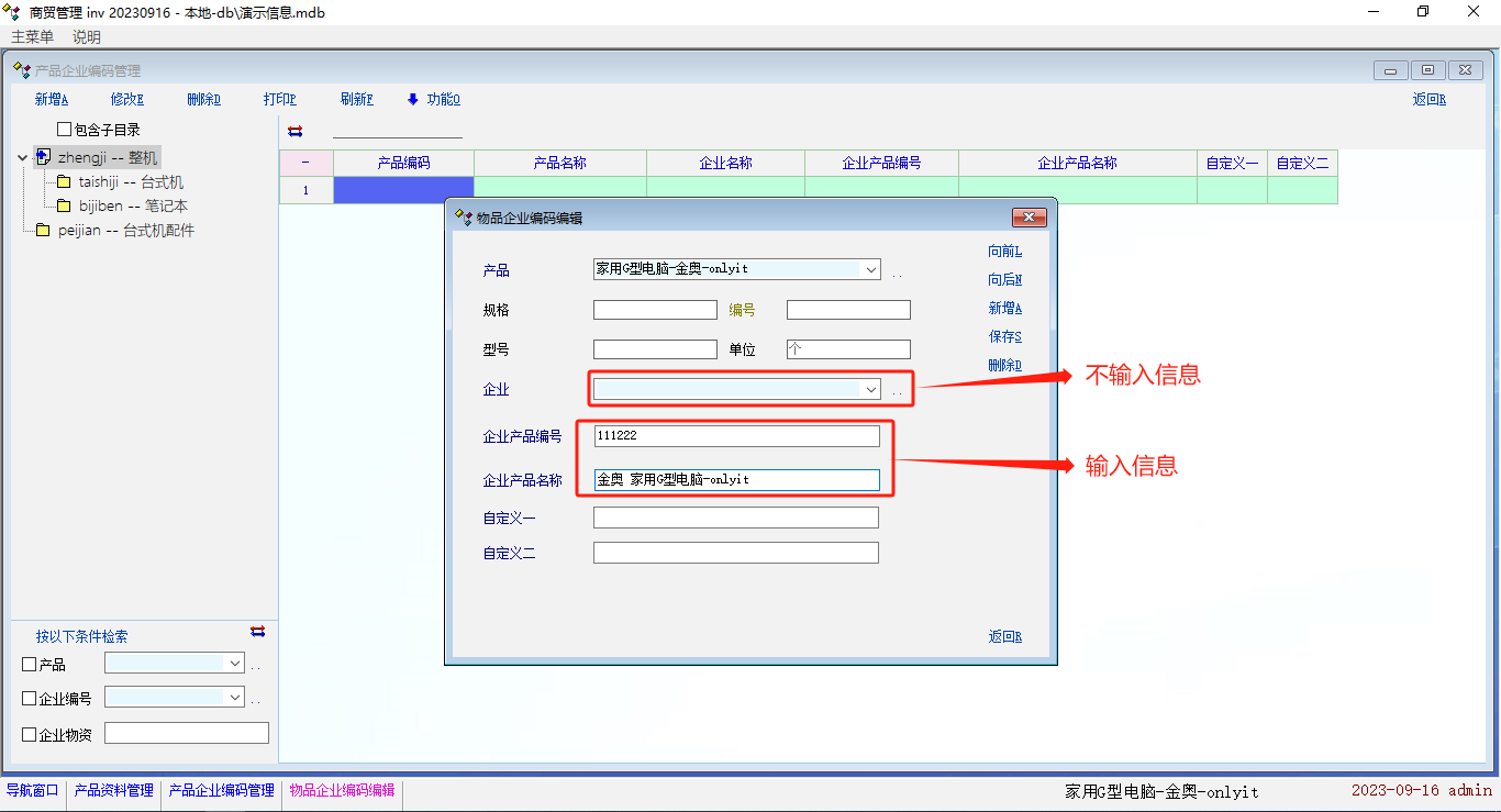 建立新产品信息,在 物品企业编码编辑中,只输入 企业产品编号和企业产品名称,忘记输入 企业信息 的情况下,