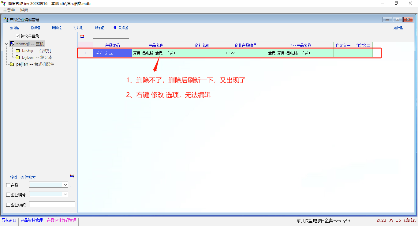 会出现新建立的产品,删除后,一刷新又出现的情况,刷新后又出现的产品 右键  修改 选项无法进人编辑。