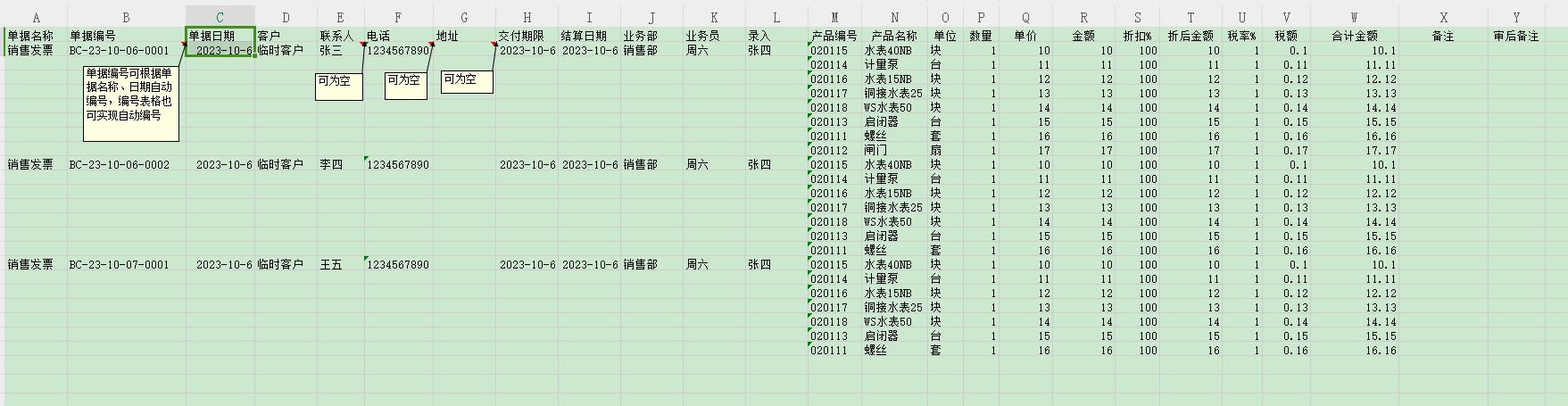 销售开票单据暂不不涉及上级销售订单、发货等单据,批量导入表格模板由开具发票数据转换而来,