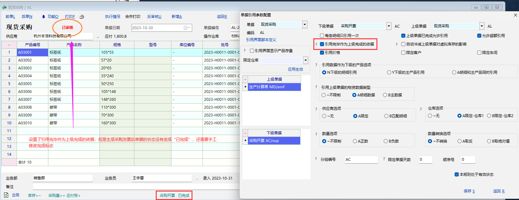 我的“现货采购”单据设置了下级单据“采购发票”并且设置了“引用完成作为上级完成的依据”,但是生成“采购发票”后,“现货采购”单据的状态依然是“已审核”,还需要手工设置单据完成的标志。