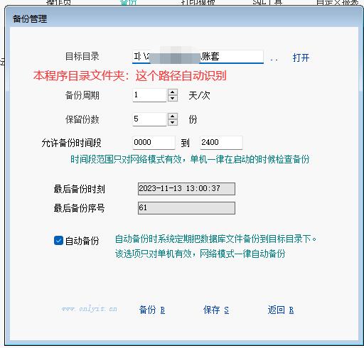 因为要经常更换电脑,每换一个电脑,移动硬盘的盘符就不一样,导致打开账套时不会备份。因为备份目录不存。所以建议增加一个备份到程序文件夹里内,这样就不受路径不同导致备份失败