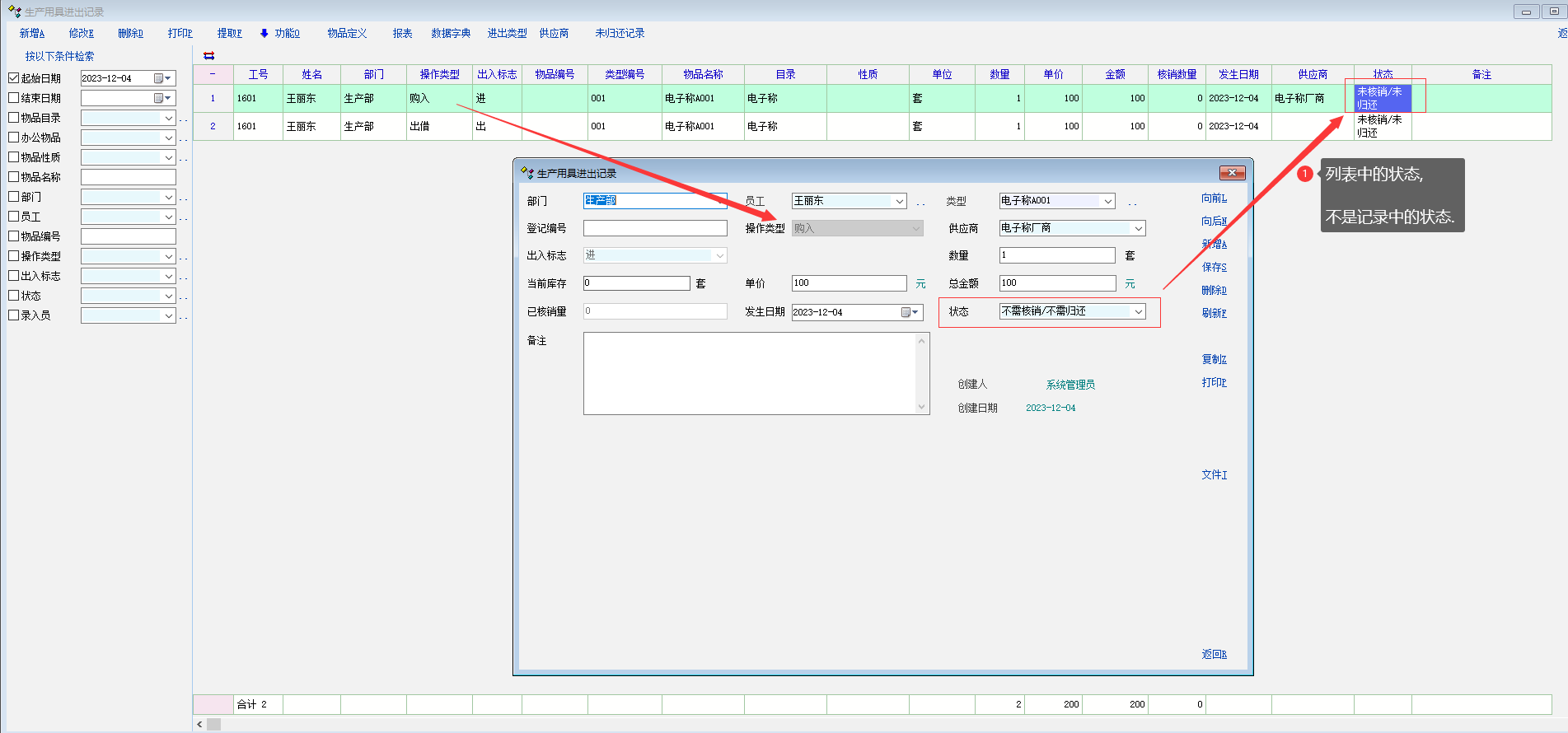 1 出借了一台电子称, 在归还核销时, 右键创建核销记录, 报错. 没有界面.