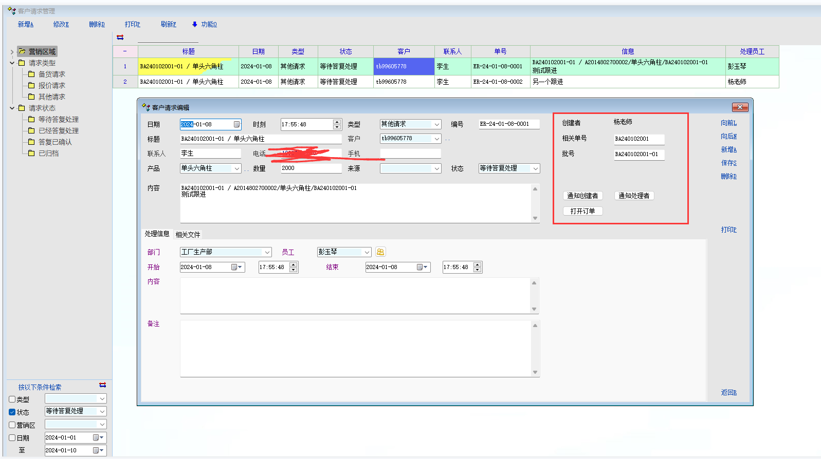 业务场景: 客服针对客户下的订单中的产品(需要批号, 订单号,生产要求等)发生的问题, 登记; 咨询生产相关人员, 要求生产相关人员提供答复的过程; 建议: 1 增加创建用户, 创建用户发给解决问题人员, 解决问题人员回复之后,需要再反馈通知到创建用户。 2 增加自定义扩展列,方便业务单据对接。 3 左侧检索条件增加 创建用户。 |