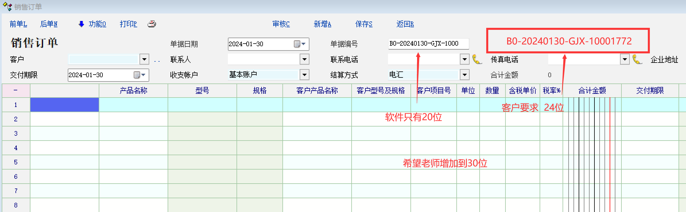 现在客户很多编号规则导致订单编号都很长,我们现在软件只有20位,希望老师能加长 单据编号位数,扩展到30位;如图