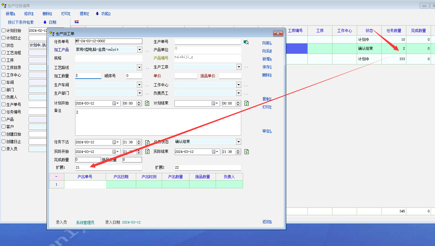3. 先打开有附加属性值的生产任务单 , 记录的附加属性值显示正确
