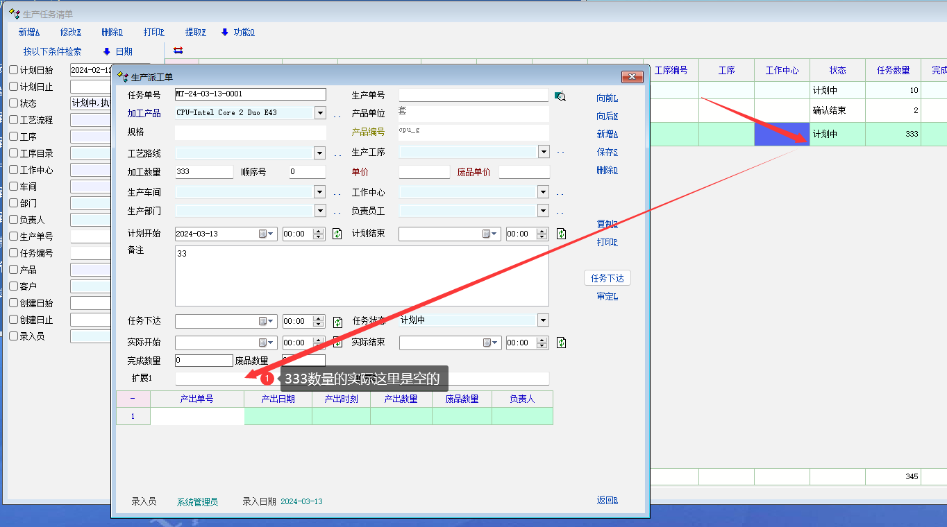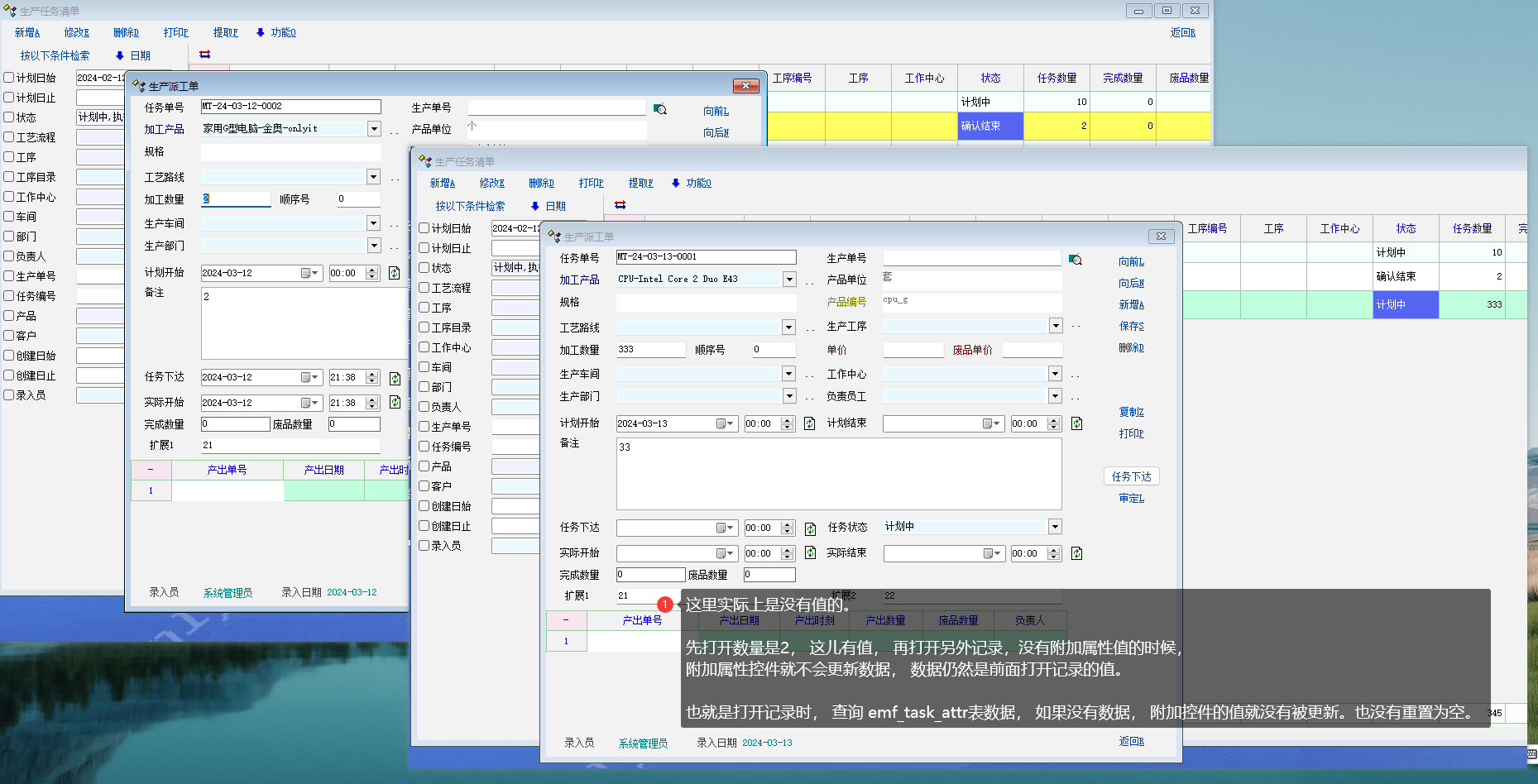 4. 再打开 没有附加属性值的生产任务单, 记录的附加属性值仍然保持上一条的值, 不会变为空