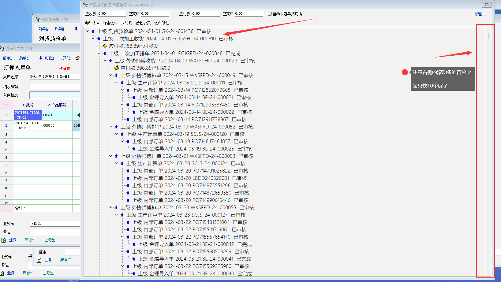 应用场景: 流程自上往下走经过非常多的单据, 系统将这个单据往上往下所有涉及到的单据都查询出来了. 耗时1分钟左右. 请看截图: 建议调整: 1 如果系统是将此单据涉及的物料的所有有关的单据都查询出来. 那么我们是不是可以不查单据的执行情况, 只查单据中某一款物料的单据执行情况? 没有包含这款物料的单据就不用显示. 在某单据中物料多, 又不需要其他物料的情况下, 会提升效率. 2 可以单独先把界面显示出来, 再设置查询: 往上 / 往下 / 全部 执行情况. 就是可以再细化地调整要查询执行情况的方向, 数量, 这样会提升速度 , 也会防止查询的数据量过大, 其他客户端卡死的现象. |
