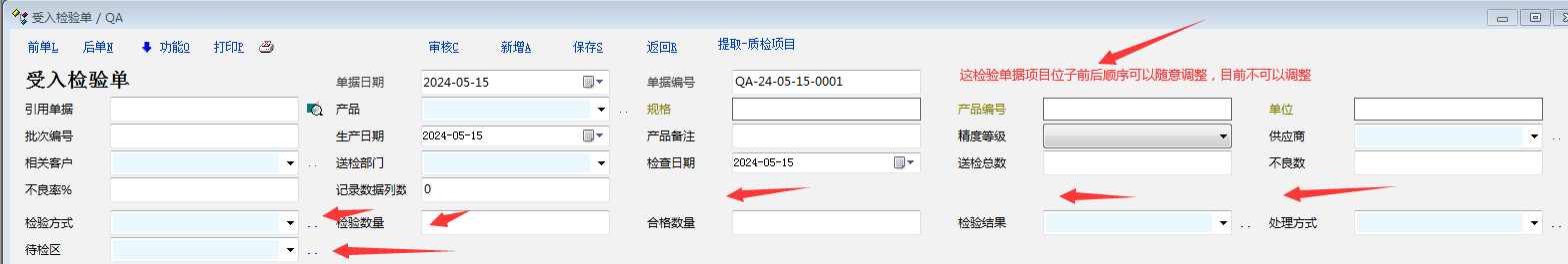 原创_检验单据----表头项目用户自己可以调整位子_产供销