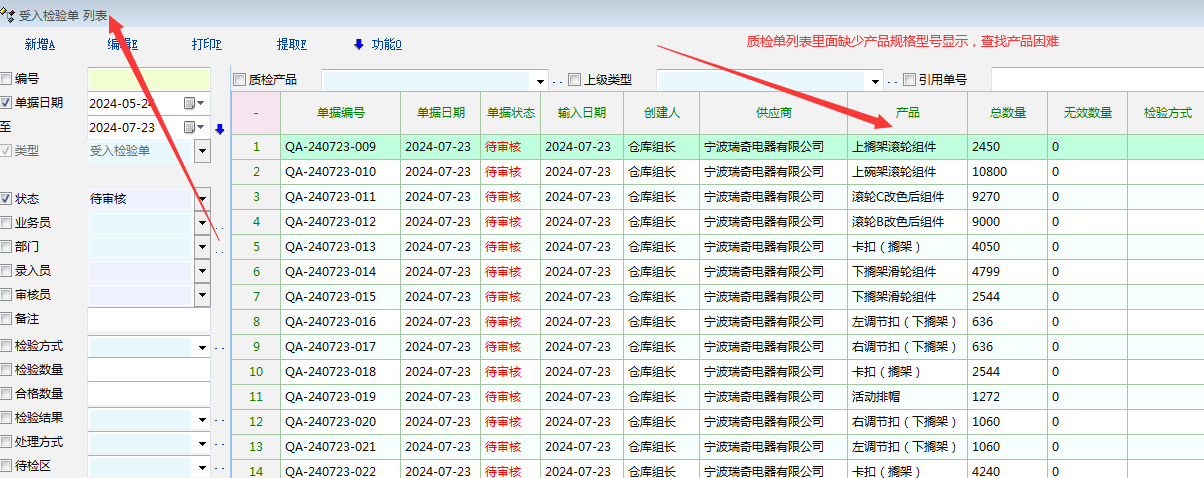 原创_质检单列表里面缺少产品规格型号的显示---造成查找产品困难_产供销