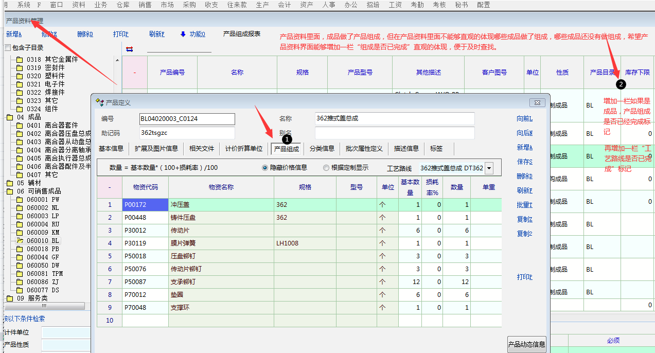 产品资料界面---增加“产品组成是否已完成标记”------“工艺路线是否已完成标记”      这样在产品资料界面能够看到成品里面,哪些已经完成了产品组成、工艺路线等工作,哪些没有完成,以便于快速查找、新建没有完成的产品组成与工艺路线。
