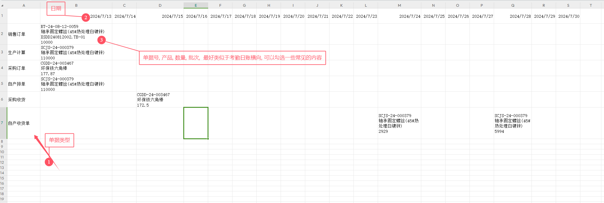 业务场景: 客户使用批次管理, 从订单 到 生产 到交货, 全过程. 批次追踪表使用非常频繁, 非常有作用. 有利于了解一个产品目前的状况. 客户提出来, 如果产品生产过长, 某些单据过多, 就不太直观, 不能很好的判断出数据流向. 我思考过后, 建议添加一个横向的展示方案, 就如同考勤日账中横向展示一样. 详细看图: 横向报表, 很容易根据日期, 数量, 不同的单据类型, 看出变化. 有点类似于甘特图一样. |