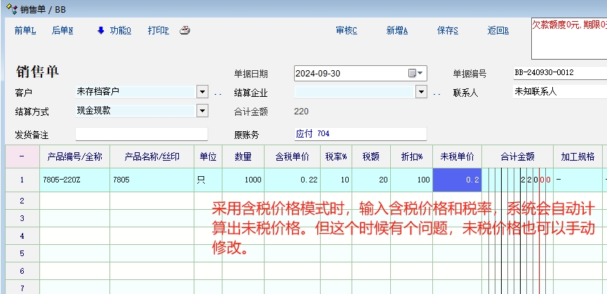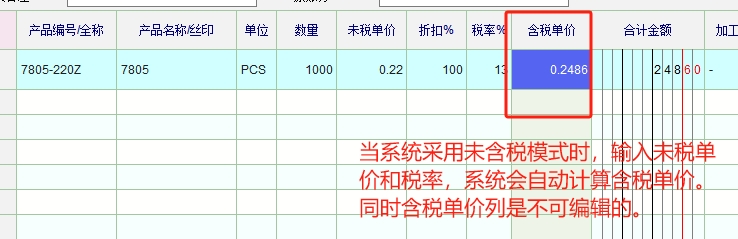 不管采用哪种模式,含税价格和未税价格只能是一个处于可编辑状态,另外一个由系统结合税率自动计算得出。税率确定了的情况下,我们要么只能输入含税价格,要么只能输入未税价格,两者是数学运算关系,不能两者都可以同时手动输入。