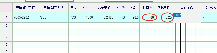 如图,把未税单价修改为0.25,系统的含税价格0.2486和税率13%都保持不变,合计金额也保持不变,而折扣自动变为了88%。正确的逻辑应该是修改了未税单价,税率和折扣都保持不变,但是含税价格自动重新计算调整。