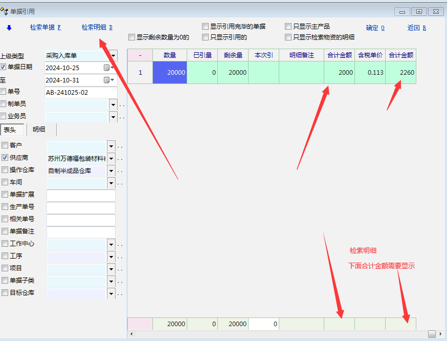原创_单据引用界面里面---检索明细时---需要显示列表下面的合计金额_产供销
