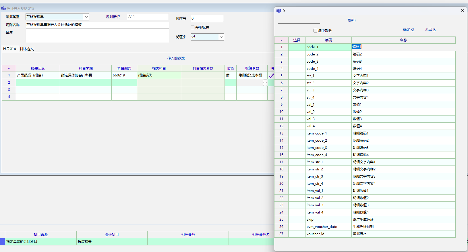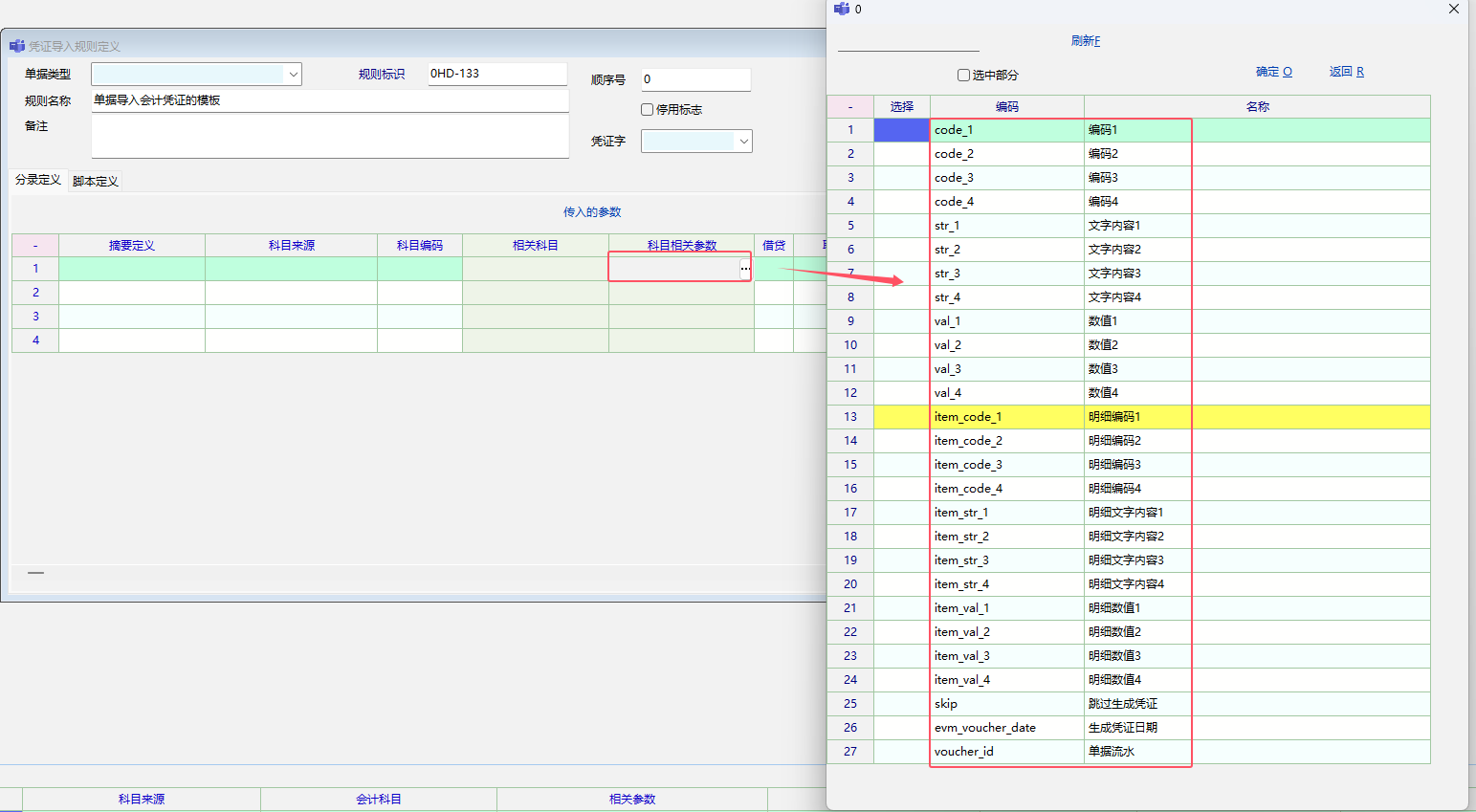 单据类型选择后,“传入的参数”里有,但是科目相关参数和取值参数里还是看不到,除非根据传入的参数直接输入。
