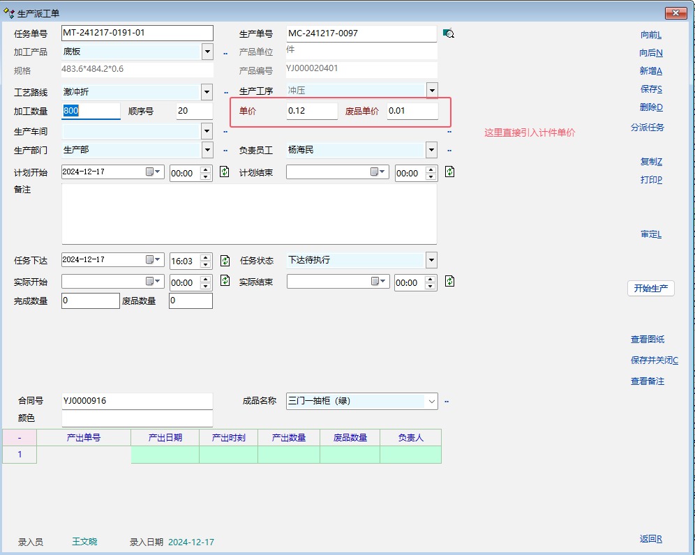 一个产品如果在计件价格中进行了定义,建议在创建工序任务单、工序产出单中直接引入这个计件价格,这样便于比较方便地查询计件金额。
