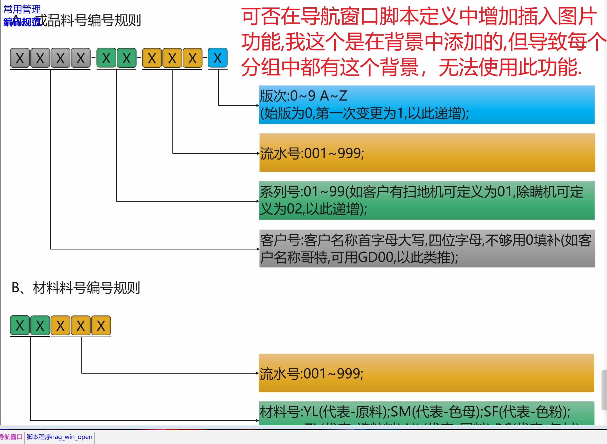 可否在导航窗口脚本定义中增加插入图片功能,我这个是在设置背景图(nag_set_bg_img)中添加的图片,但导致每个分组中都有这个背景,故无法使用此功能。 且需求有对图片的约束功能,如x,y,w,h的功能。且需要插入在哪个分组下等等; 原由:在导航窗口脚本定义中也可实际此图片功能,但太麻烦。 如能添加此功能则可以延伸做一些流程,比如销售流程,采购流程,仓库流程等等,用插入图片的功能就可以实现。因在系统外有一些专业的流程图软件,做出来的效果简单,直观,漂亮。 |