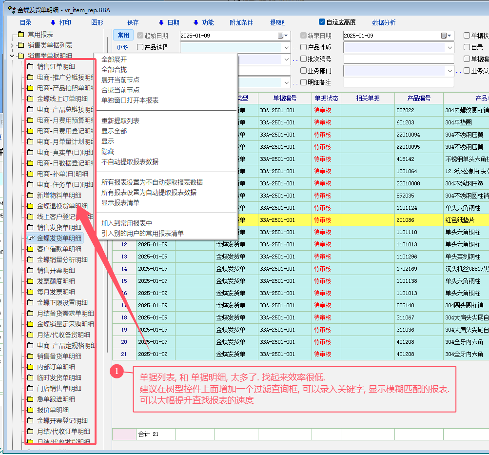 建议在树形控件上面再增加一个模糊匹配框, 可以直接录入报表相关名称, 模糊匹配出来对应的报表节点来.