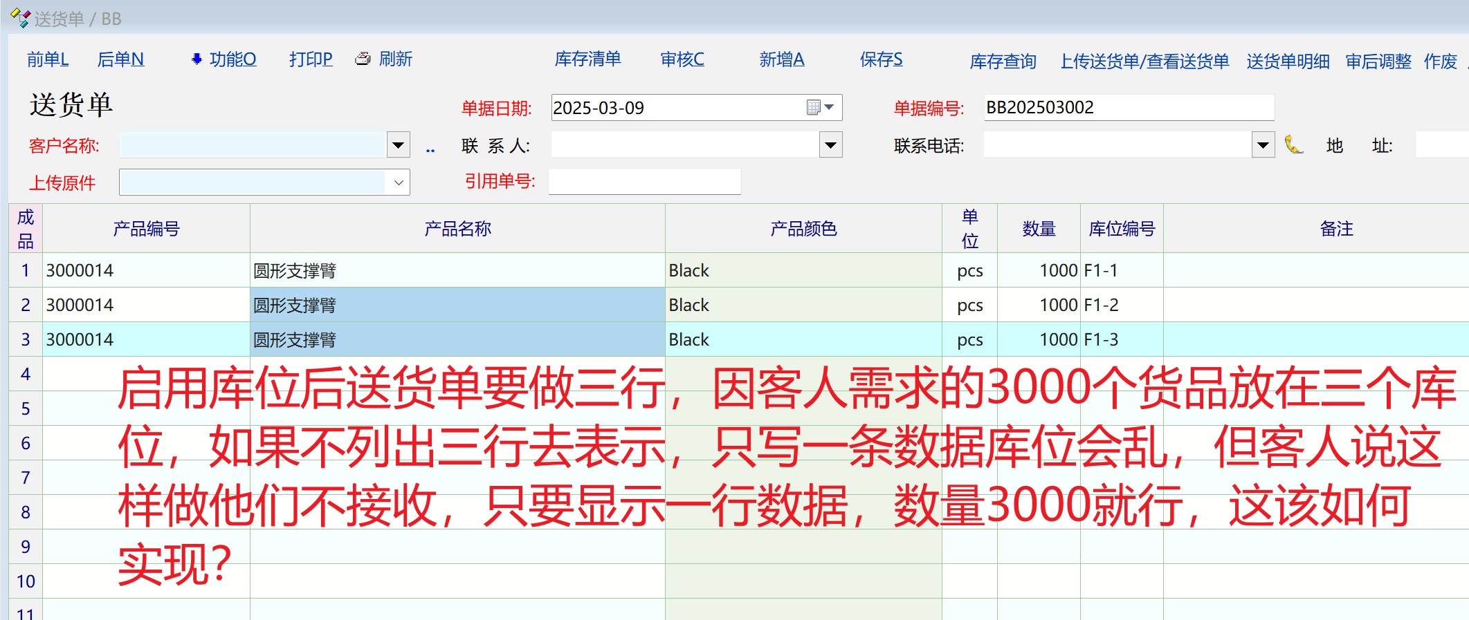 我司仓库一定要用库位管理,但在启用库位后我现在碰到的问题是图2的效果,一张送货单上同一款产品要列出多行,因有库位列需要填写;