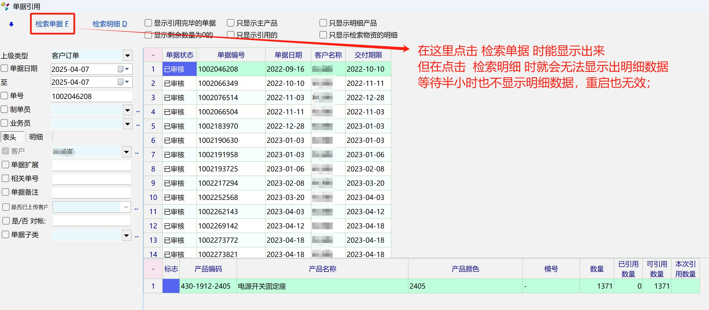 F6引用销售订单  检索明细时