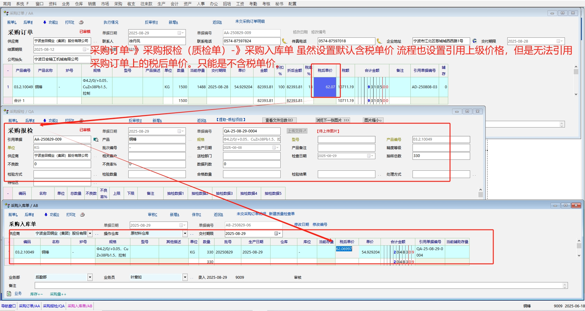 采购订单.》采购报检(质检单)-》采购入库单 虽然设置默认含税单价 流程也设置引用上级价格,但是无法引用