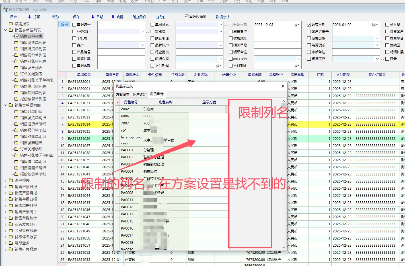 2.解决方案:在显示定制界面 操作员或角色 限制查看列,显示定制里不能显示限制列。操作员定制方案后默认会自动绑定自己,这个操作员只能看到自己显示定制的方案不会影响到别人。