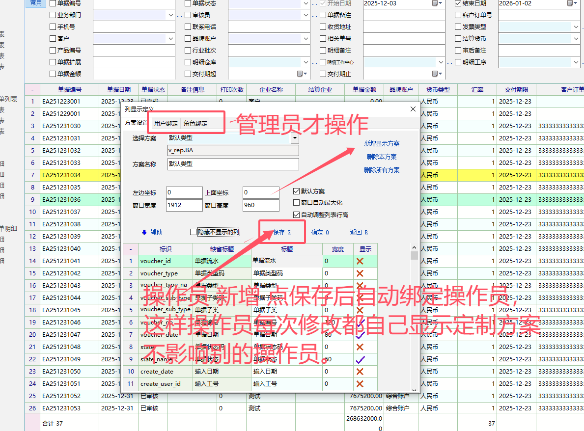 2. 显示方案中对普通操作员或角色中增加不显示的列的设置(多选), 加载显示方案的时候, 要先查询有没有绑定显示方案, 有没有限制不显示的列, 如果有, 过滤掉这些列.