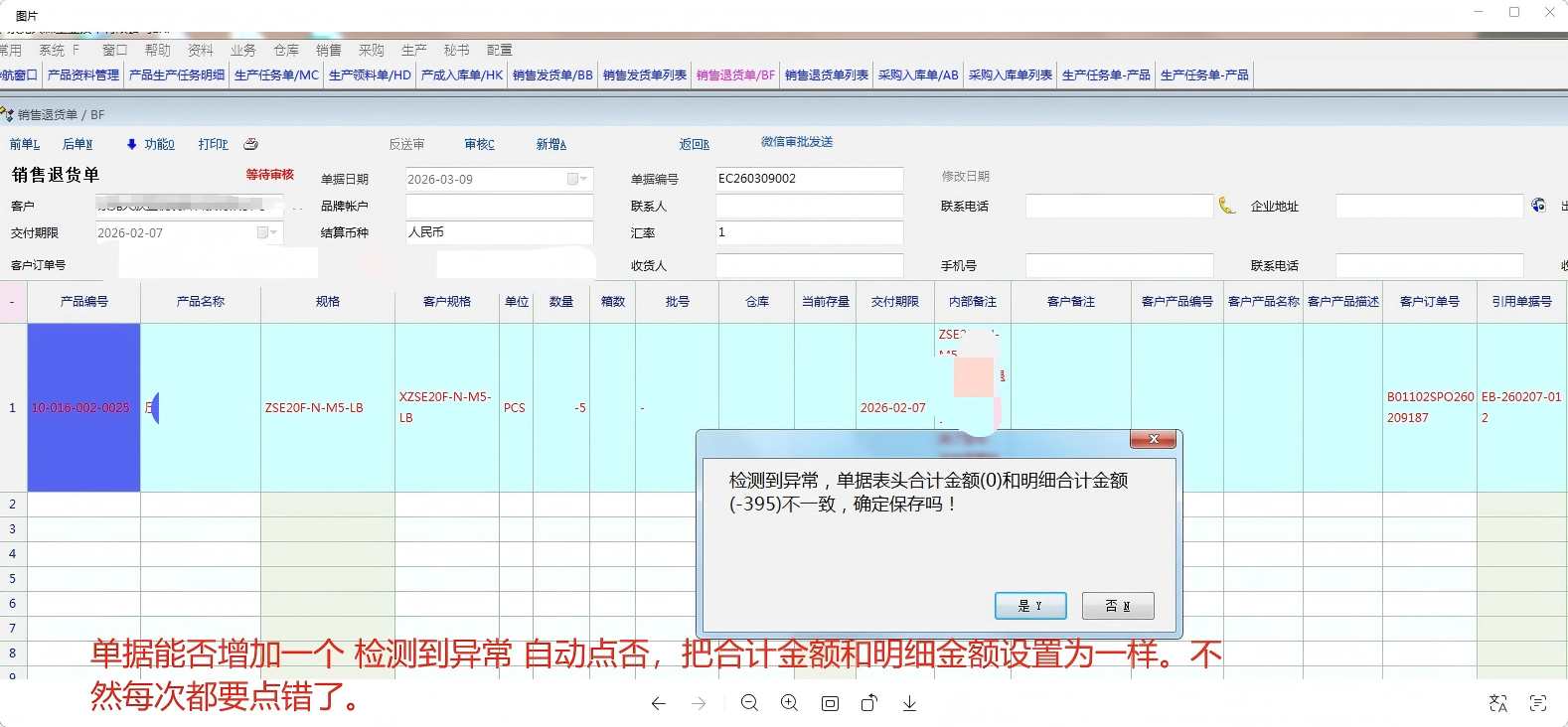 这个上次建议过孟老师, 因为单据金额是0, 不生成往来. 有个客户提出来. 就是这种情况时点了是引起的. 建议是直接将表头金额修改为一致, 提示这个感觉是没有什么用的. 点了是, 很容易生成问题, 后续又来查账. 这个很容易创建数据问题. 应该尽快调整修复. |