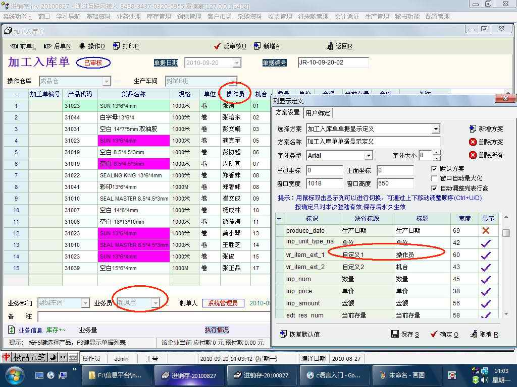 因为是生产型企业,车间每天要进行入库作业的操作员较多,如果为每个操作员建一个加工入库单的话不是很方便,现在是用[自定义]一栏定义操作员,但因无法下拉浏览,每次都需手工输入人名,不是很方便,并且可有会出错,同时在报表中查询时也需在对应的[明细扩展]中手工输入人名进行查询。