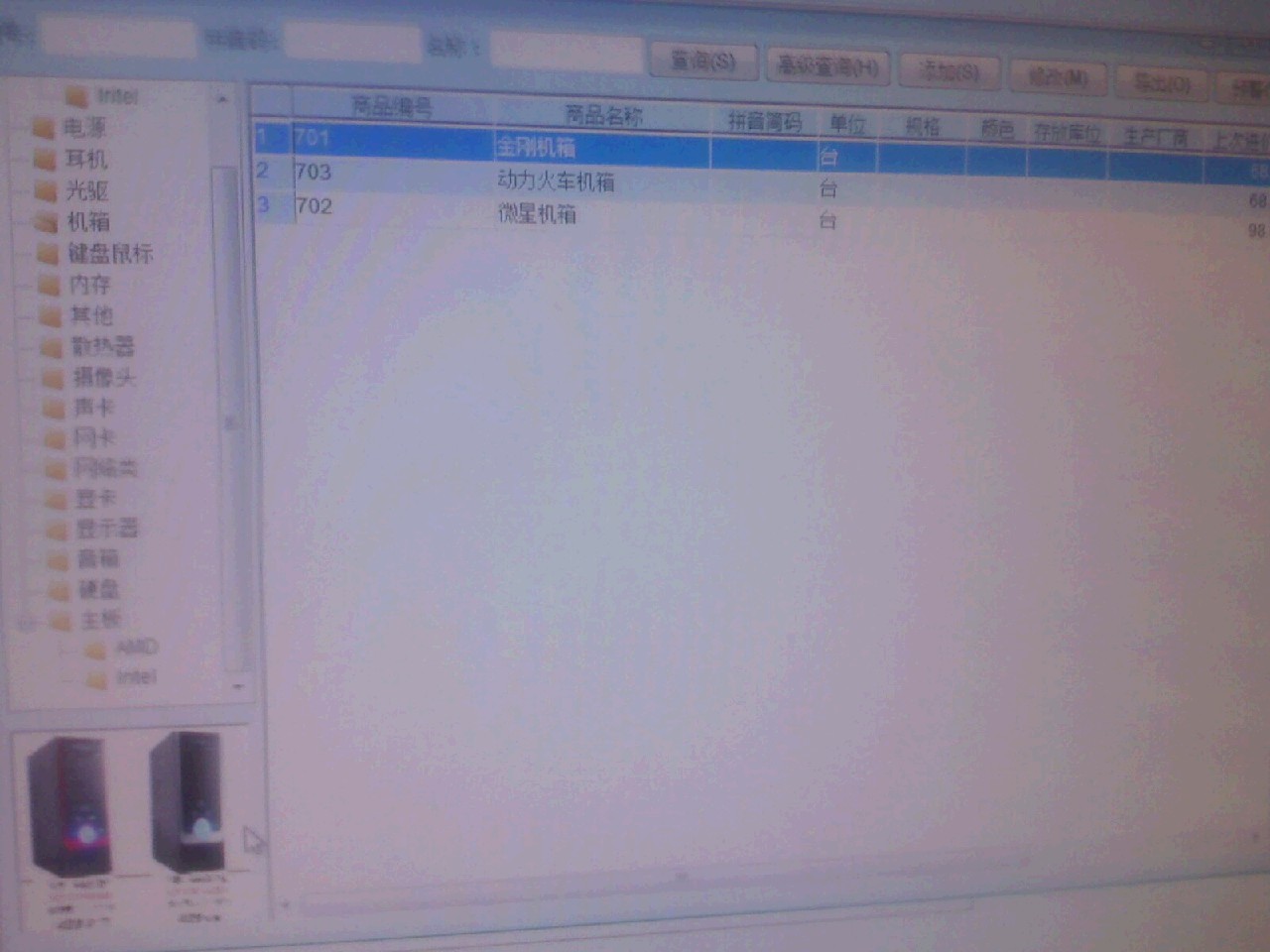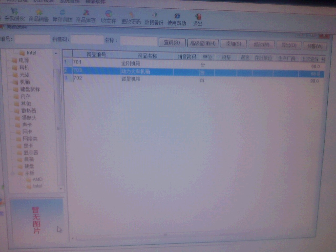 建议添加图片显示功能,既然产品资料里面支持有物品图片,那么应该在库存、采购,及销售各单据选择商品时体现出来(缩略图),双击时操作系统中的图片查看软件能打开图片,这样更为直观。建议添加在选择商品窗口的右下角,那的空位比较大一些