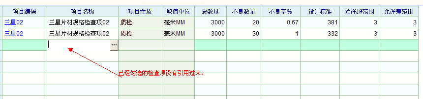二、假设我在质检项目中定义了10个检查项目,分别是产品的长、宽、厚、内尺寸1、内尺寸2等等10项目,然后生成一张质检单据,但是再明细里只能引用2-4个检查项,而且有时候引用是错误的,这里请开发人员亲自检查下,顺边说一下,里面的不良率什么不会自动计算啊,我们填了总数量和不良数,为什么不良率不会计算?