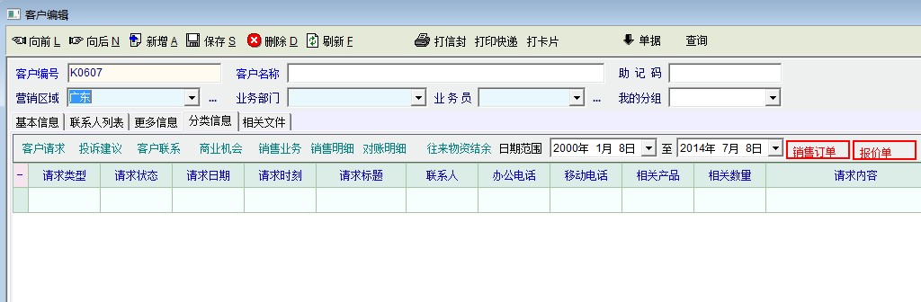 系统在软件设计细节上还是有很大的问题:就像上面的建议一样,在单据中可以开报价单与销售订单,但如果想查询该客户的报价单与销售订单清单的话,却必须离开客户编辑,在别的地方查询(到别的地方查询,还要选择输入客户、单据类型等资料)很不合理、很不方便。个人感觉,软件功能很多,很全面,但在整合、人性化方面就做得很不到位,没有把这些功能当做一个整体来处理,而是都当做一个独立单元各自为政,低效又杂乱无章。