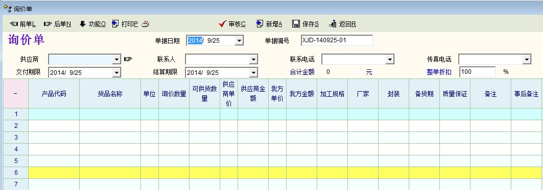 我们询价,供应商给我们报价,是一样的,但一个产品,询价、报价时除了价格,还有其它非常多的信息需要包含进去,就如上图中的询价单一样。系统中的这个供应商报价功能确实过于简单,而且跟询价单好像也是同一个概念,重复的!所以建议用询价单代替。