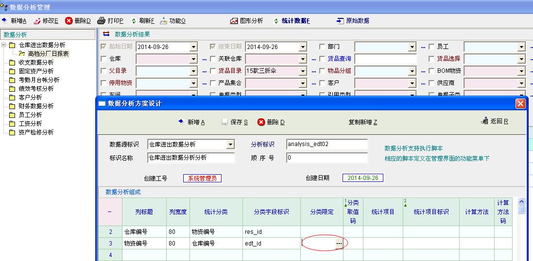 数据分析方案一般可用来设计有针对性的分析报表,这类报表的数据检索条件有一部分是固定的,比如说某类产品不同出入类别的汇总。但是在数据分析管理的脚本里只是支持检索完数据后的一些处理,没有检索前的检索条件自定义,每次提取分析方案都要手工输入一些固定条件。脚本中load_ext()函数只能在提取数据后修改检索控件,还要重新提取才能生效。