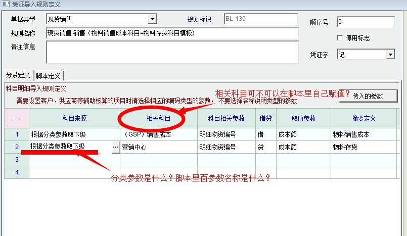 引入业务凭证模板功能很强大。是日常进销存业务单据自动进入账务系统的纽带。现在系统的模板功能已经比较强大,可以完成绝大多数的引入业务凭证功能。但是各个单位有一些特别的需求或者具体会计人员各有不同的工作习惯和需求,要求系统能有一定的灵活性。比如我们单位的会计在库存商品下设置有三级明细科目,具体到总公司下属分公司(需独立核算),以及分公司下不同仓库。比如1405.01.02代表库存商品科目下的营销中心下的GSP库存,1405.01.01代表库存商品科目下的营销中心下的通用库存。现在的销售单录入时可以选择仓库。如图:但是在引入模板定义里面相关科目的设定是死的,即必须在模板里选定死。比如库存商品要么选1405.01.02要么选1405.01.01,这样当销售单商品从不同仓库出货时,引入单据时科目就会发生错误。系统有脚本,可以提取到销售单号,进而可以取得仓库号,但是不知道相关科目的变量名,也不知道是否可以赋值。请老师协助解答。