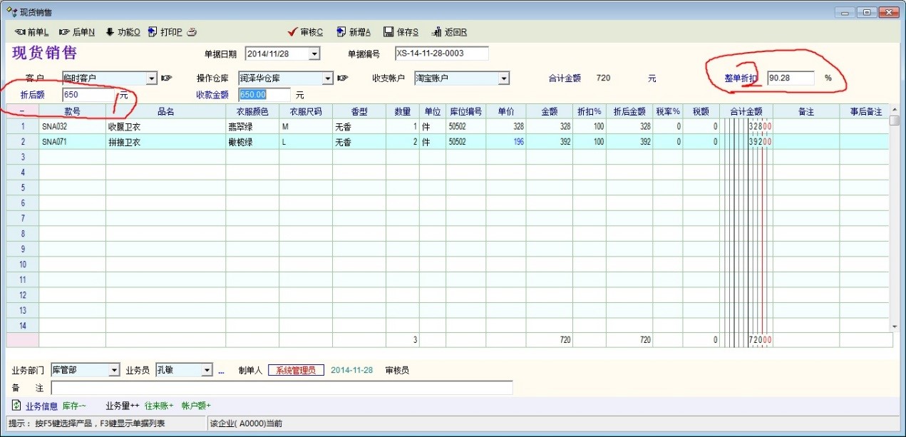 现象:直接输入“折后额”后,在销售报表中统计金额合计与实现不一致,如图2图3图4,图2+图3是单