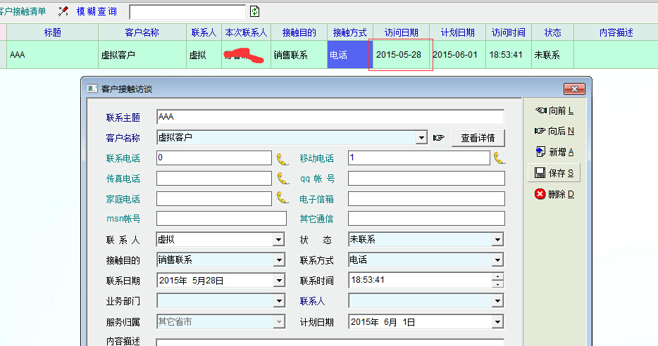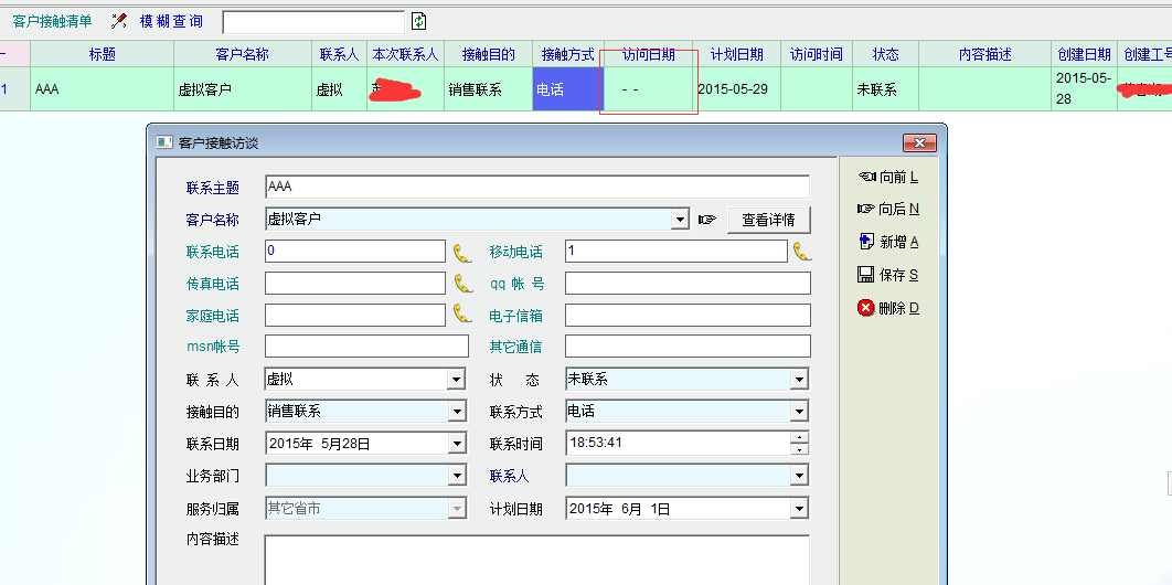 另外,计划制定后,系统无法修改计划的时间。如图4,在客户接触清单列表中打开刚刚制定好,尚未执行的客户接触计划,修改计划日期(到6月1日)后保存,系统自动生成了一个记录接触访谈内容的记录,如图5(注意看清单列表上的访问日期已经不是空的,而是现在的时间。