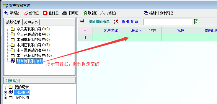 如图,客户接触管理中,有时候时时提示有数据,但点击后却不展现数据。经测试,**联系、所有待联系存在这个现象,而**已联系的则不存在这个问题。