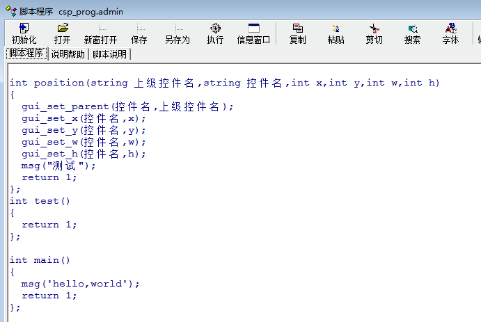 如何从A脚本中调用B脚本中的自定义函数?比如,在csp_prog_admin中自定义函数如下 int position(string 上级控件名,string 控件名,int x,int y,int w,int h) { gui_set_parent(控件名,上级控件名); gui_set_x(控件名,x); gui_set_y(控件名,y); gui_set_w(控件名,w); gui_set_h(控件名,h); msg("测试"); return 1; }; int test() { return 1; }; int main() { msg('hello,world'); return 1; }; 然后想在客户管理脚本rec.eba窗口中引用position函数,在rec.eba脚本中写入如下语句 int func_f9_call() { call_str('call_prog.csp_prog.admin.position("TabSheet3","SpeedButton_Next",500,300,100,30)'); return 1 }; 引用position函数,但结果并不正确。 也测试过以下几种写法 call_str('call_csp.csp_prog.admin.position("TabSheet3","SpeedButton_Next",500,300,100,30)'); call_csp.csp_prog.admin.position("TabSheet3","SpeedButton_Next",500,300,100,30); call_prog.csp_prog.admin.position("TabSheet3","SpeedButton_Next",500,300,100,30); 但结果都不正确。 请教老师,正确的方法应该是什么呢? |