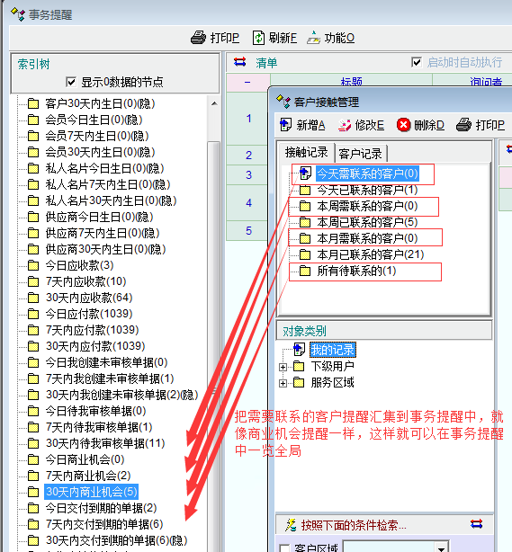 把需要联系的客户提醒汇集到事务提醒中,就像商业机会提醒一样,这样就可以在事务提醒中一览全局,减少在不同的功能模块中过于烦杂的切换。