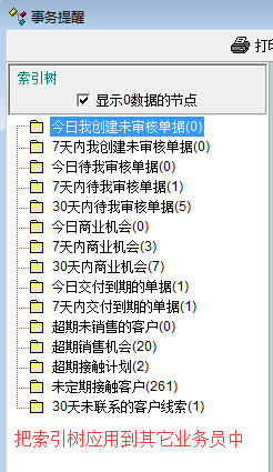 为事务提醒中的索引树添加共享功能,应用到其它业务员中去。这样,当每个业务员的需求都差不多的时候,可以省略掉每个业务员都对索引树进行定制的步骤,就跟导航界面一样。