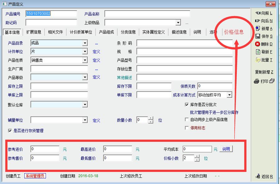 鉴于价格信息对于大多数企业来说,都是非常敏感的问题,但是增加修改产品资料又需要放权限给普通的仓库人员,采购人员,销售人员等,建议在产品资料中单独做一个关于价格信息的选项卡,同时进行授权管理。