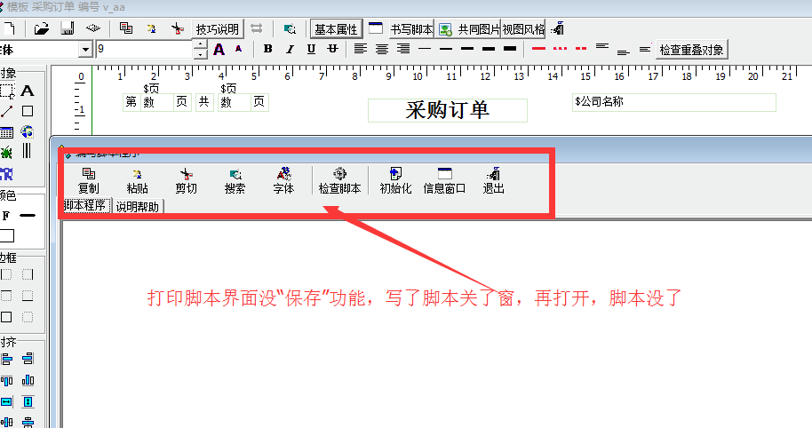 打印模板脚本没有“保存”功能,写的脚本关了窗口后,重开,脚本没了。