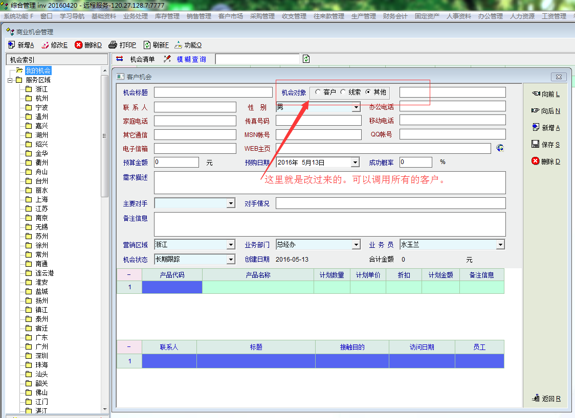 建议把需要调用到客户资料的地方都改成像商业机会一样的界面,目前除了商业机会之外,别的比如:客户联系,投诉建议、送样单、报价单等单据都只能调用建档的客户,而不能调用客户线索里面的客户或直接添加客户。