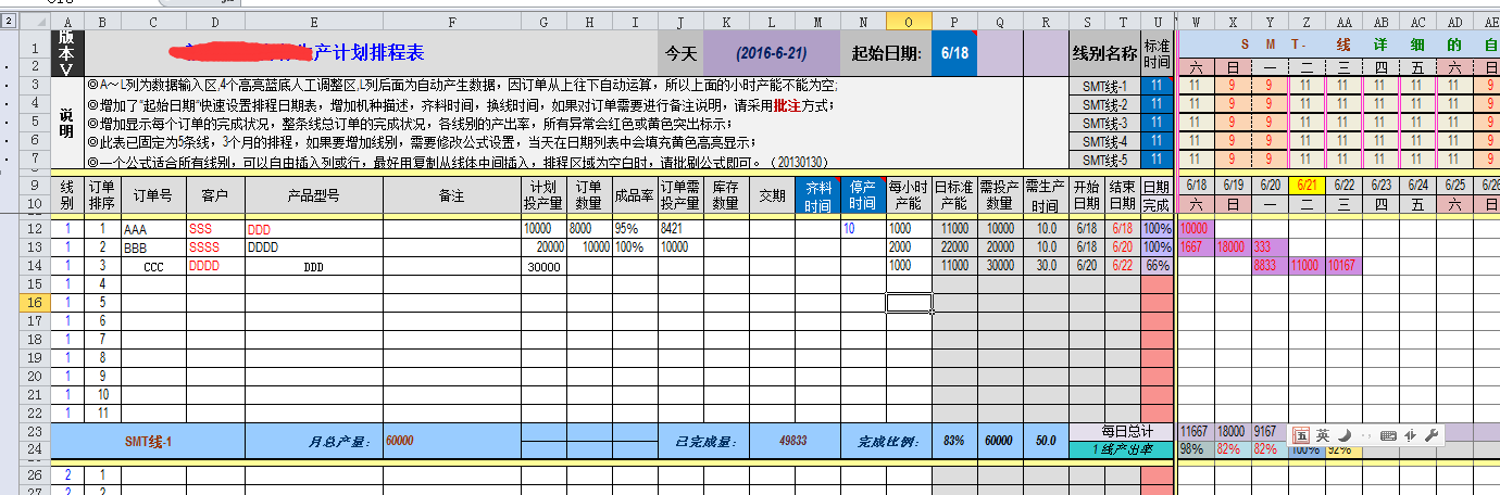 系统在生产管理方面感觉是越来越完善了,但总觉得少了些什么功能。研究了许久,发现好像没有生产排程方面的功能。虽然有生产计划单,但却缺少具体生产安排、控制方面的功能。有了订单或生产计划单,就要按照单位的实际生产能力及订单的交付日期,确定生产排程,并根据实际情况随时调整生产计划、顺序等。具体可以参考下面用EXCEL编写的生产排程表。