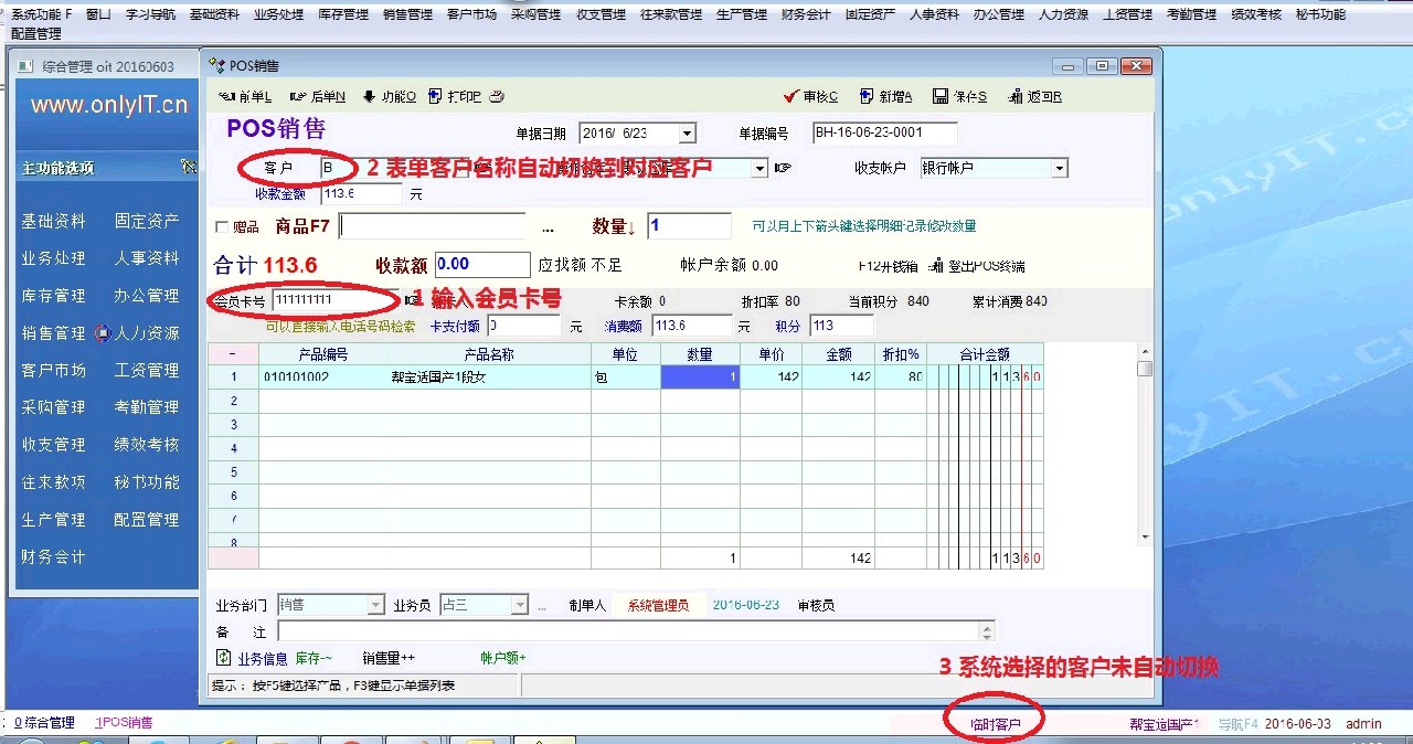 然后再做客户B的单据。输入会员卡号111111后,单据上的客户名已经自动切换到客户B。在单据中输入商品,但是引用的价格体系却为批发价。检查当时系统所选择的客户(图中标注3的位置),其实当时系统所选中的客户仍为“临时客户”,此时需要在客户栏重新回车确认一下,系统的选择才会改到客户B。